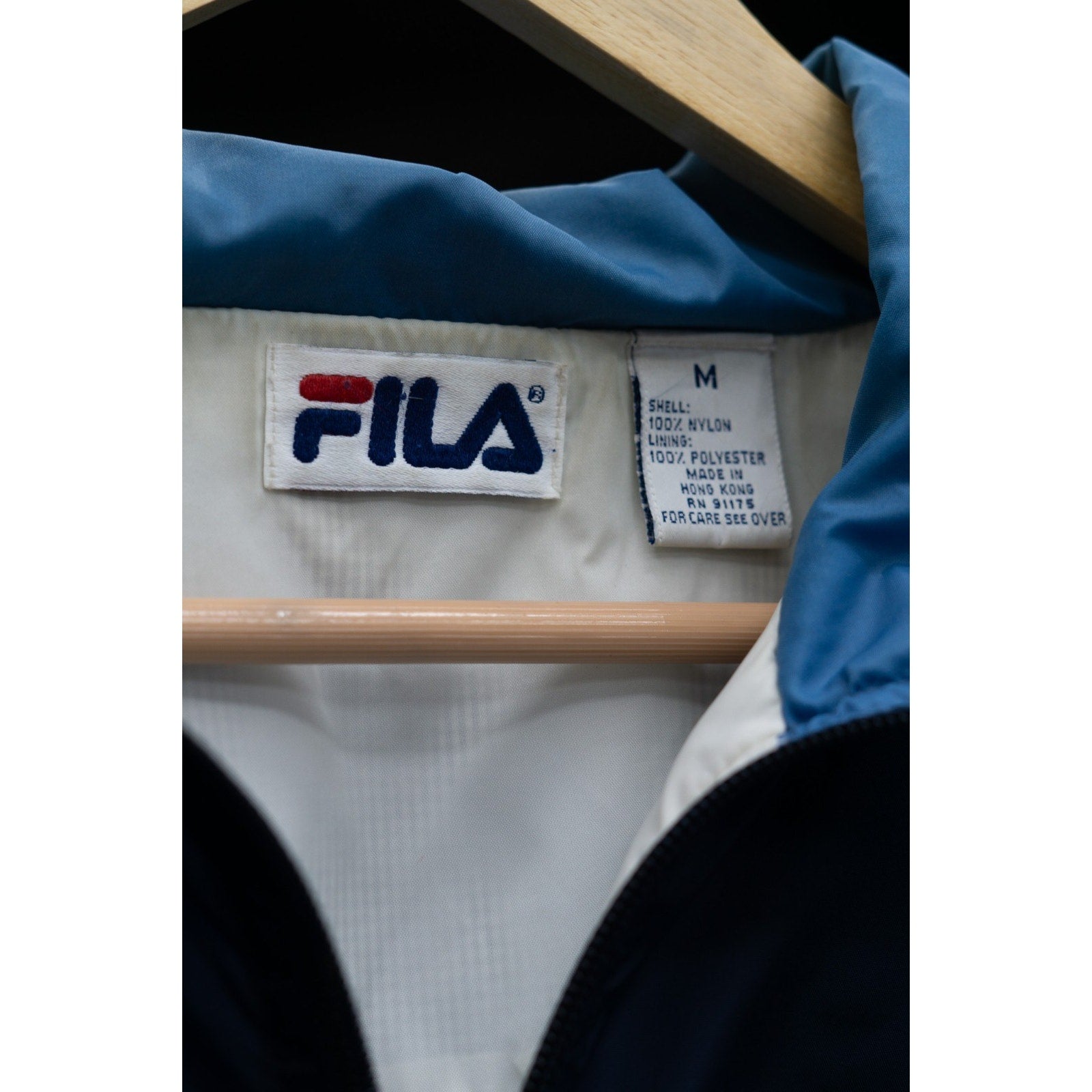 Step out in retro athletic style with this cool vintage Fila windbreaker jacket. This full-zip jacket features a classic color block design in navy blue, white, and a lighter blue, with distinctive diagonal stripes across the chest and back. A subtle embroidered Fila logo adorns the left chest, and another small logo is near the left hem. Perfect for adding a touch of 90s sportswear flair to your look.